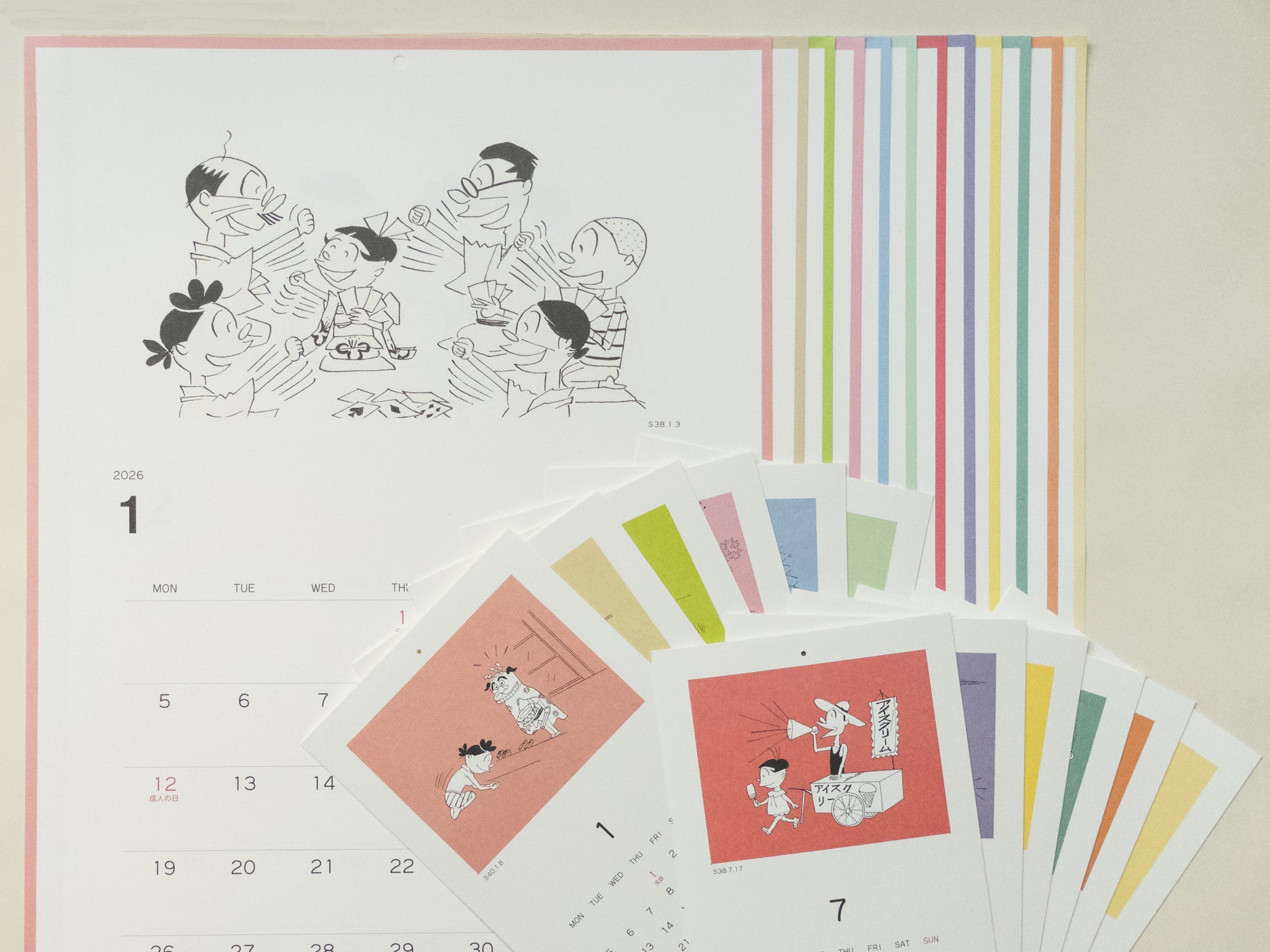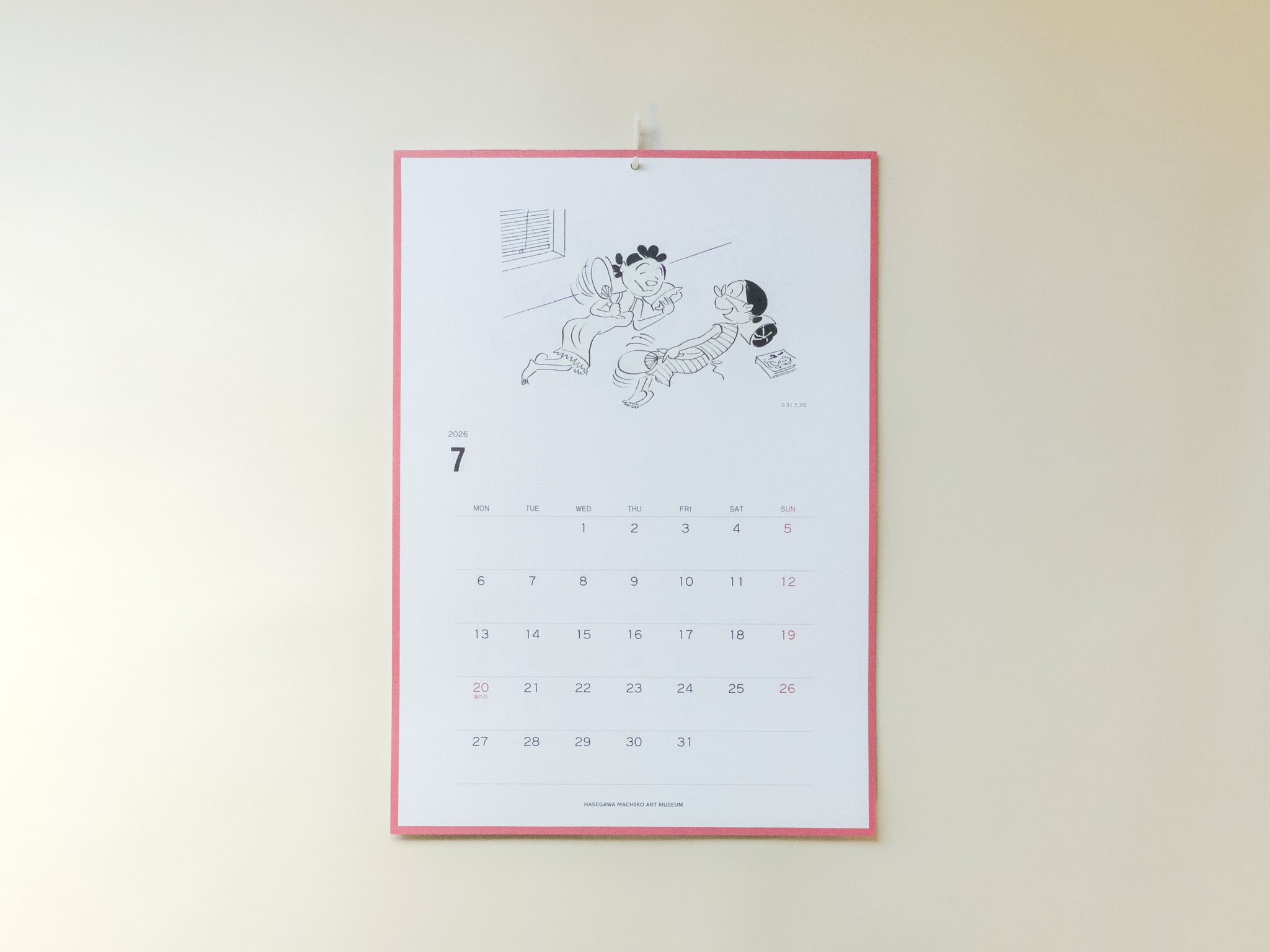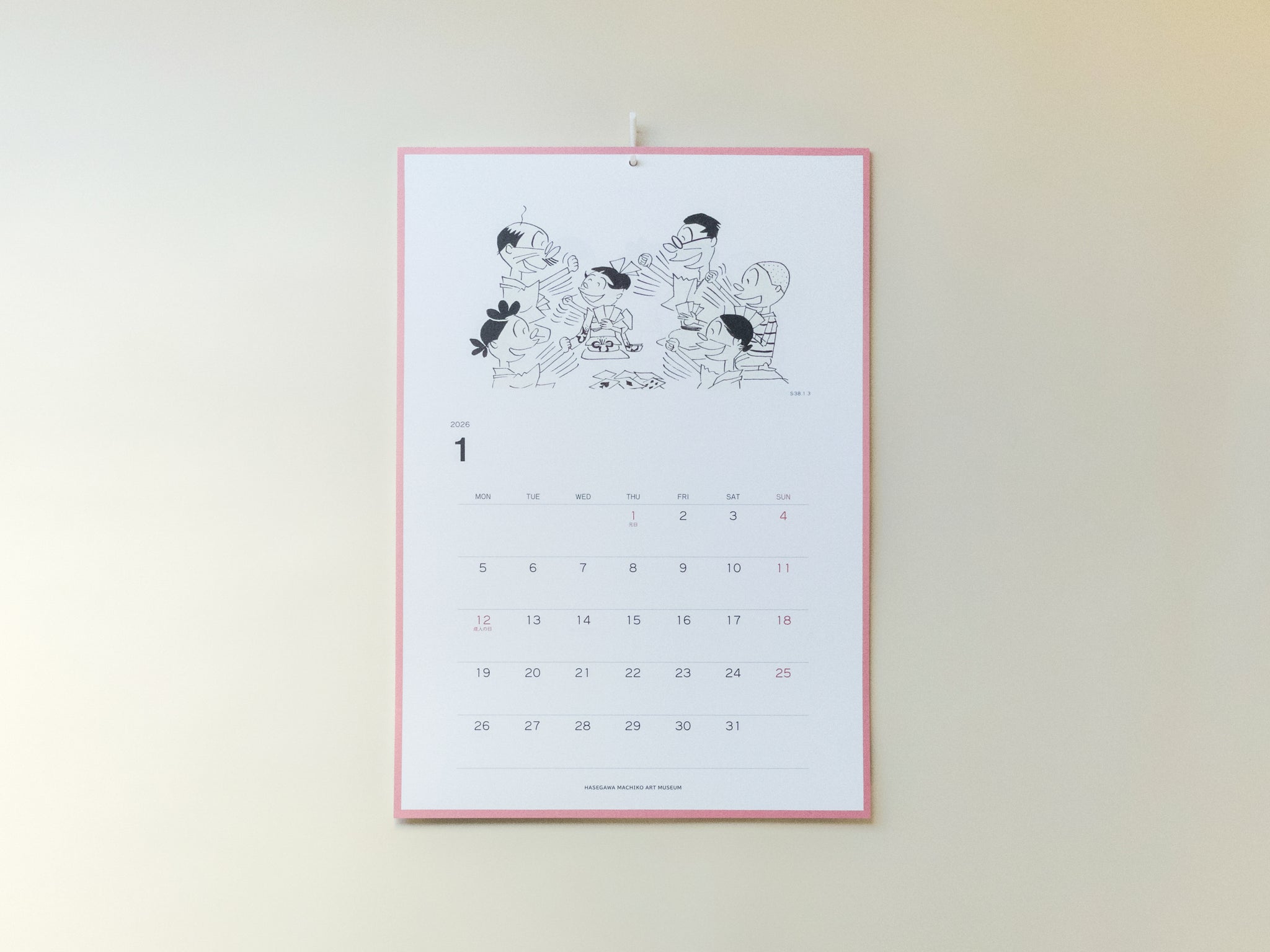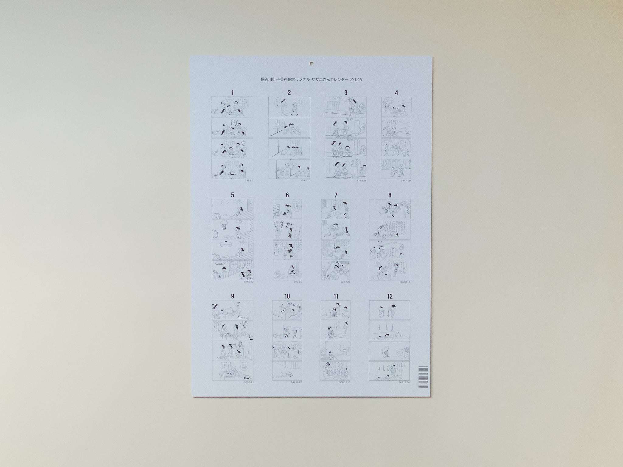 予定が書きこめる壁掛けタイプのカレンダーです。長谷川町子の描くサザエさんの原画を大きく使用してお作りしました。